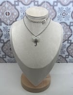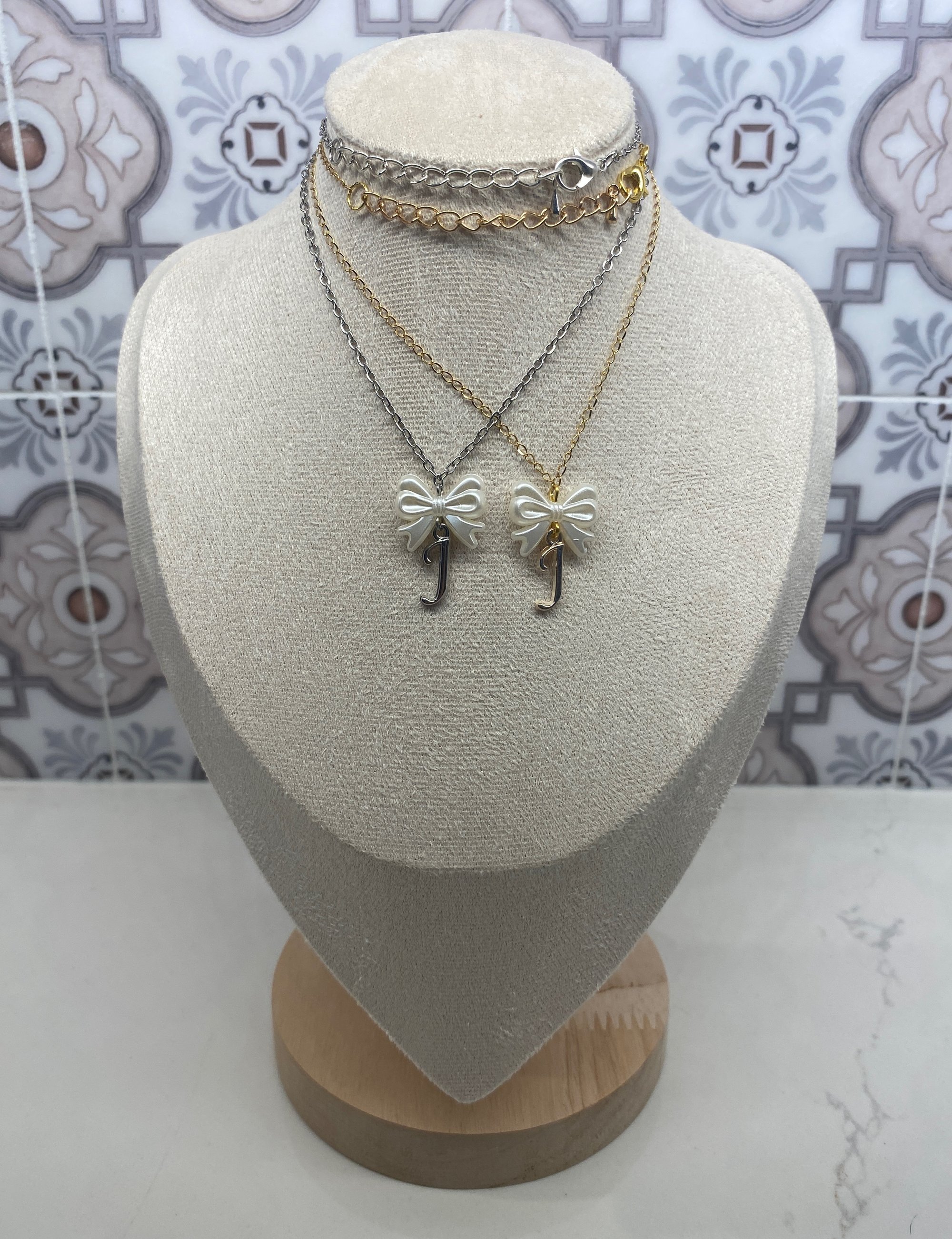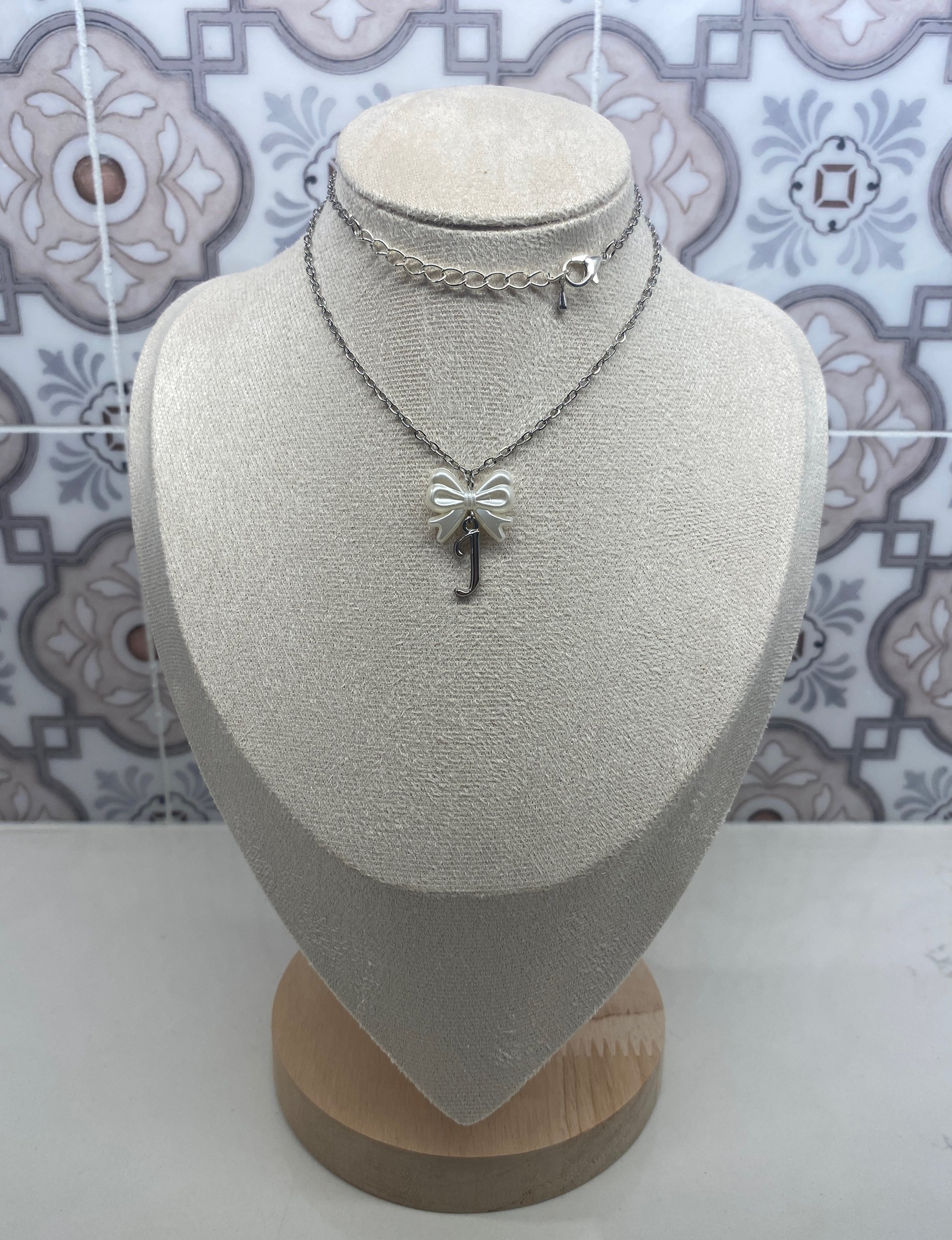 made with stainless steel letter charms, stainless steel chain, and faux pearls,