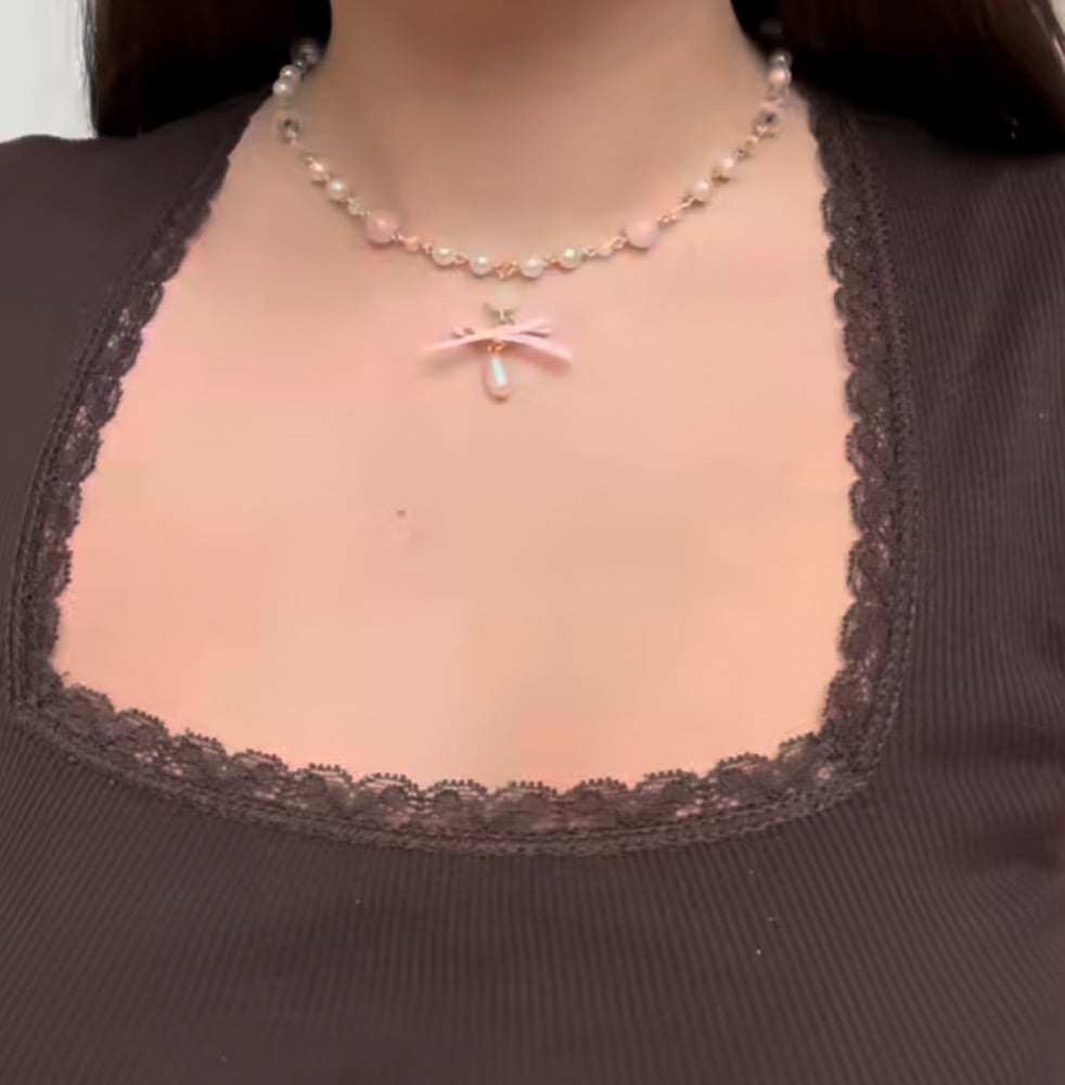 cutest coquette necklace for anyone! perfect piece to go with a simple white tank top or any cutesy top to elevate your look!