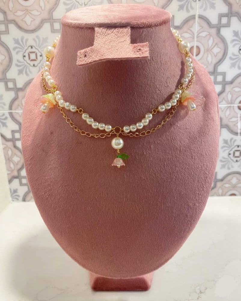 made with faux pearls, glass beads, acrylic beads, stainless steel charm